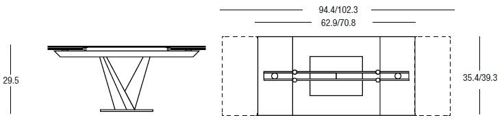 Extensible dining table, with top and extensions of rectangular glass. Base and central support of chromed or painted steel. Very easy mechanism in painted aluminum to pull out the lateral extensions allows to widen the top for 31.4. Available in a large range of sizes, the height is 29.5